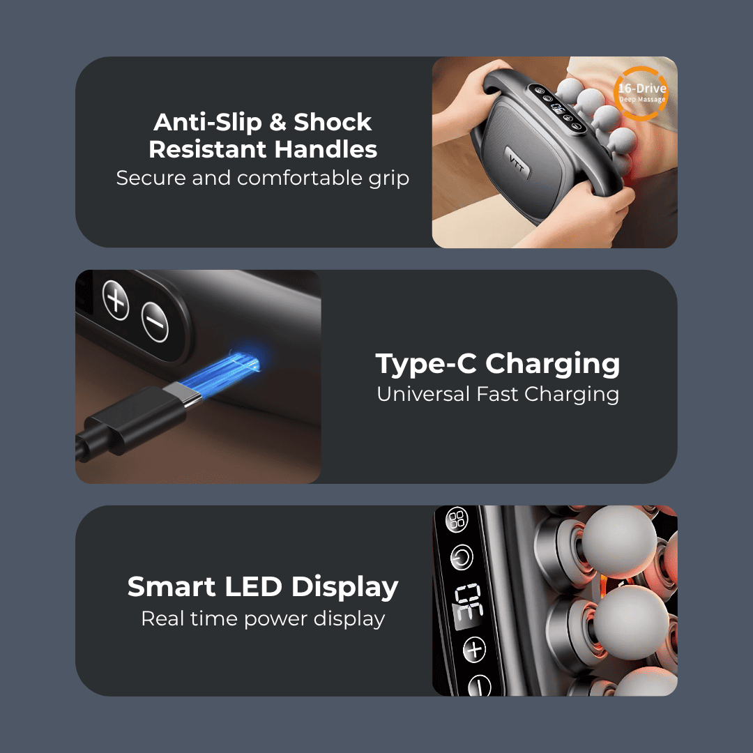 The 16-head design provides deep percussion therapy that boosts blood circulation and releases tension in sore or stiff muscles.